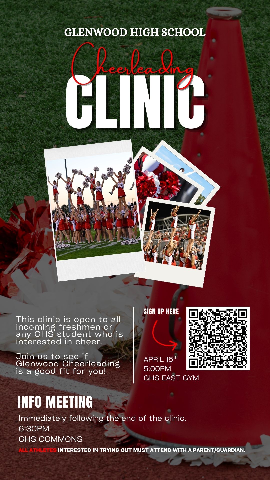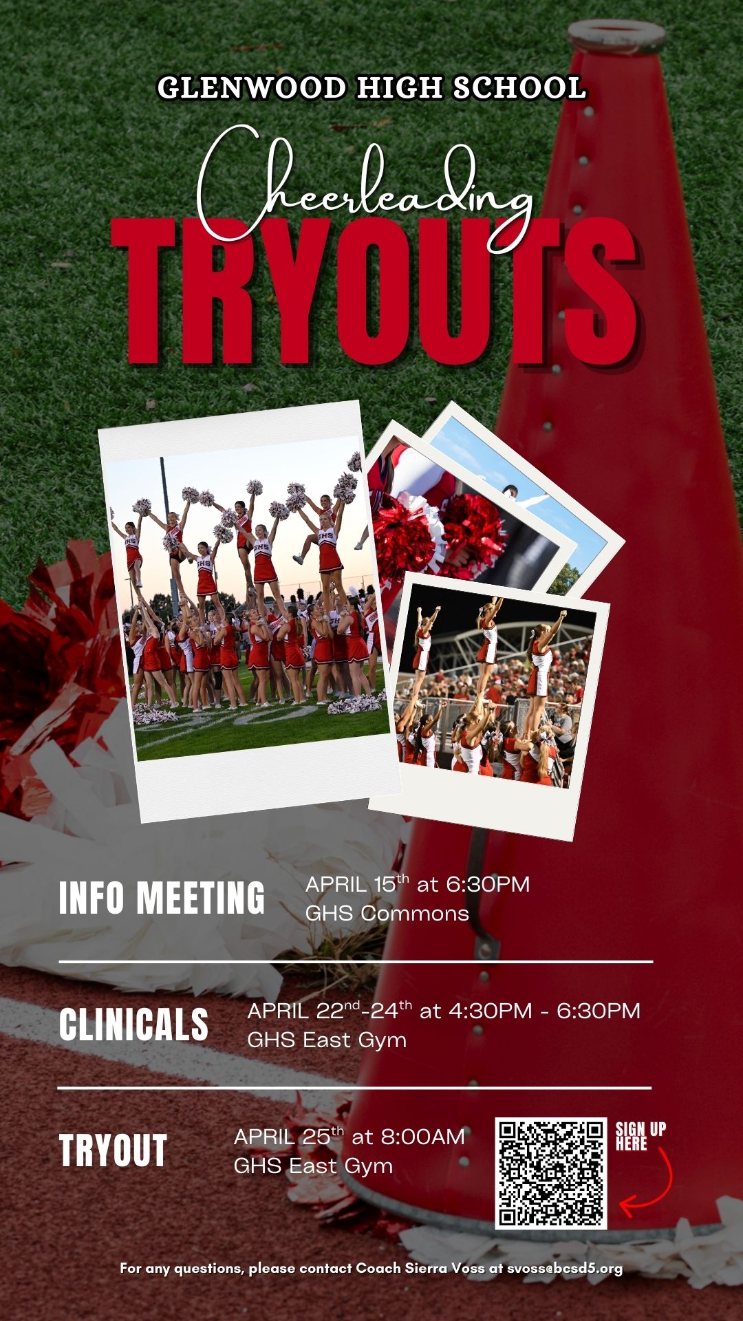 2026-2027 Fall and Winter GHS Cheerleading tryouts are being held April 22nd - April 25th | There is a mandatory informational meeting every athlete and at least one parent to attend on Wednesday, April 15th at 6:30p | Incoming freshman and new program members are invited to attend the cheer clinic prior to the meeting beginning at 5:00p | Any questions, please reach out to Coach Sierra Voss at svoss@bcsd5.org | Click the link to register for tryouts